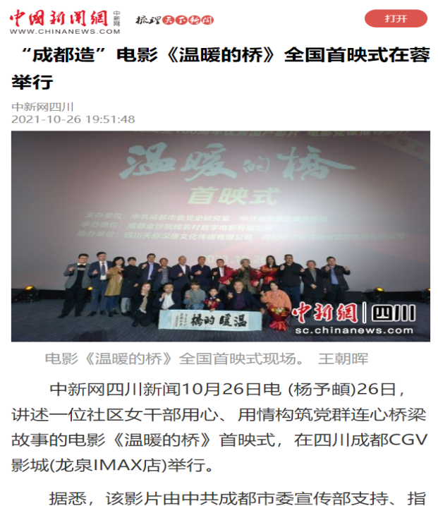 | 2 | 成都造電影《溫暖的橋》全國(guó)首映式在龍泉驛區(qū)舉行 | http://sc.china.com.cn/2021/difang/1325/1026/424065.html | 中國(guó)網(wǎng) | 網(wǎng)絡(luò) | 央媒 |