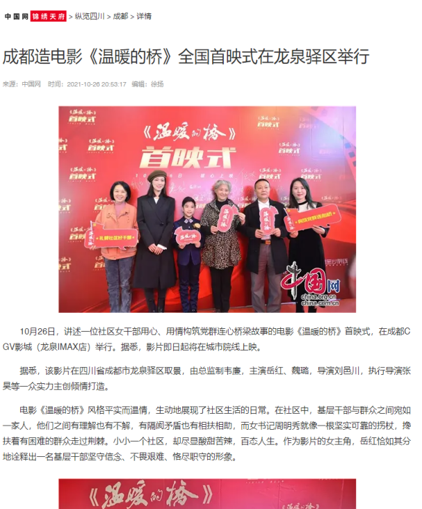 | 10 | “成都造”電影《溫暖的橋》首映 岳紅“化身”社區(qū)書記看哭觀眾 | https://e.chengdu.cn/html/2021-10/27/content_715203.htm | 成都商報(bào) | 報(bào)紙 | 市媒 |