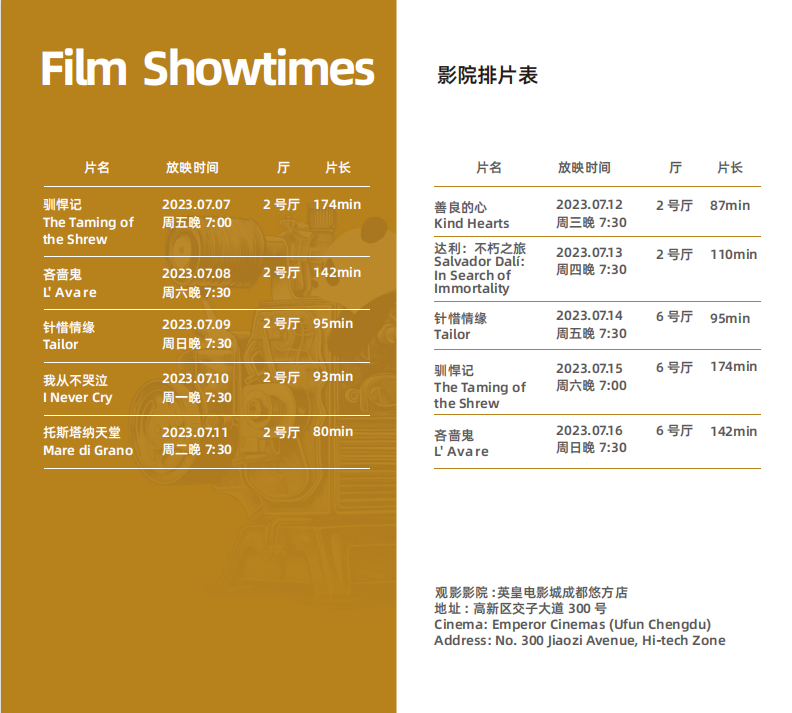 本次電影周選取的影片極具代表性。紀(jì)錄片《達(dá)利:不朽之旅》講述了西班牙超現(xiàn)實(shí)主義藝術(shù)家薩爾瓦多·達(dá)利的傳奇一生與傳世畫作;取材于英國(guó)杰出戲劇家莎士比亞最具“冒犯性”劇本的戲劇片《馴悍記》,在全片“笑果”不斷的同時(shí),也用“以古現(xiàn)今”的方式引發(fā)觀眾對(duì)當(dāng)下的思考;取材于法國(guó)著名劇作家莫里哀代表作的戲劇片《吝嗇鬼》,生動(dòng)描繪了世界文學(xué)史上“四大吝嗇鬼”之一“阿巴貢”的形象;精彩呈現(xiàn)意大利風(fēng)光的《托斯塔納天堂》將跟隨一群兒童冒險(xiǎn)家漫游到意大利托斯塔納……