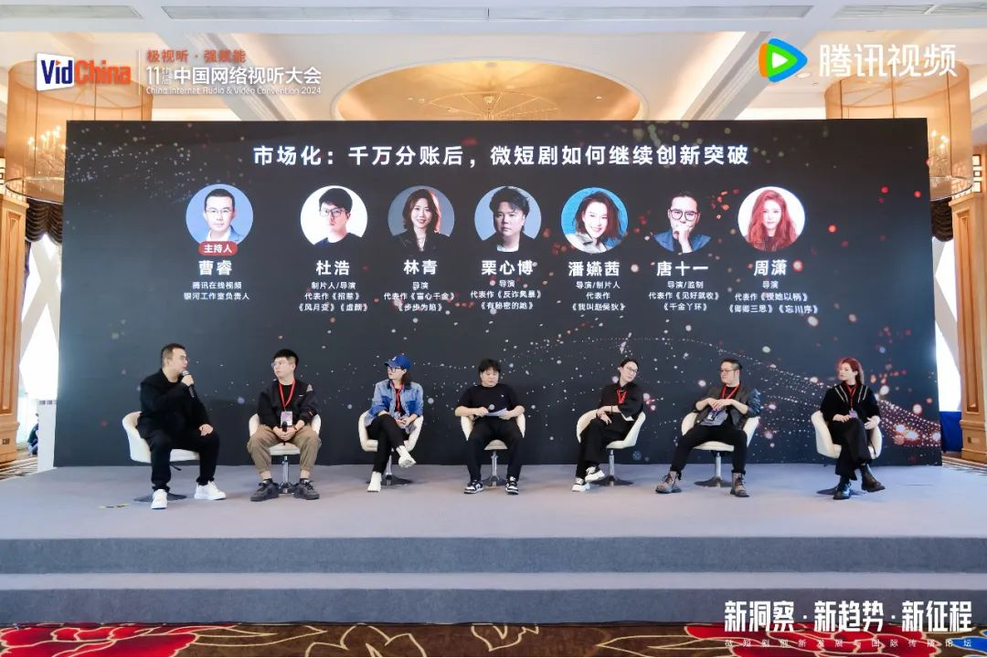 在精品化創(chuàng)制、多元類型布局的思路指引下,一批熱度與口碑兼具的微短劇涌現(xiàn)市場。在第一個(gè)圓桌對話環(huán)節(jié),騰訊在線視頻銀河工作室負(fù)責(zé)人曹睿作為主持人,與六位導(dǎo)演:《招惹》總制片人杜浩、《反詐風(fēng)暴》導(dǎo)演栗心博、《盲心千金》導(dǎo)演林青、《我叫趙吳狄》導(dǎo)演潘嬿茜、《見好就收》導(dǎo)演唐十一、《授她以柄》導(dǎo)演周瀟,共議“千萬分賬后微短劇如何繼續(xù)創(chuàng)新突破”。幾位嘉賓以“求新”為關(guān)鍵詞,分別分享自身在微短劇創(chuàng)作上關(guān)于新題材、新內(nèi)容、新情緒、新呈現(xiàn)的創(chuàng)新思路,并提出“以‘小體量’追求‘大格局’”、“情緒是最佳原動力”等創(chuàng)作理念。